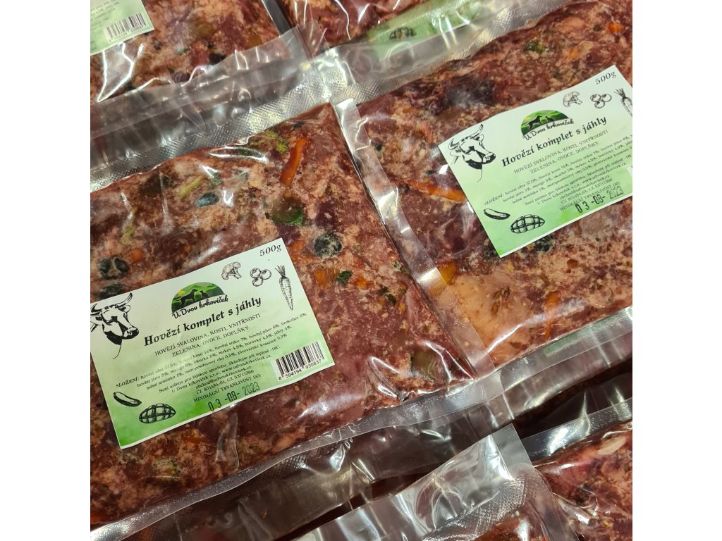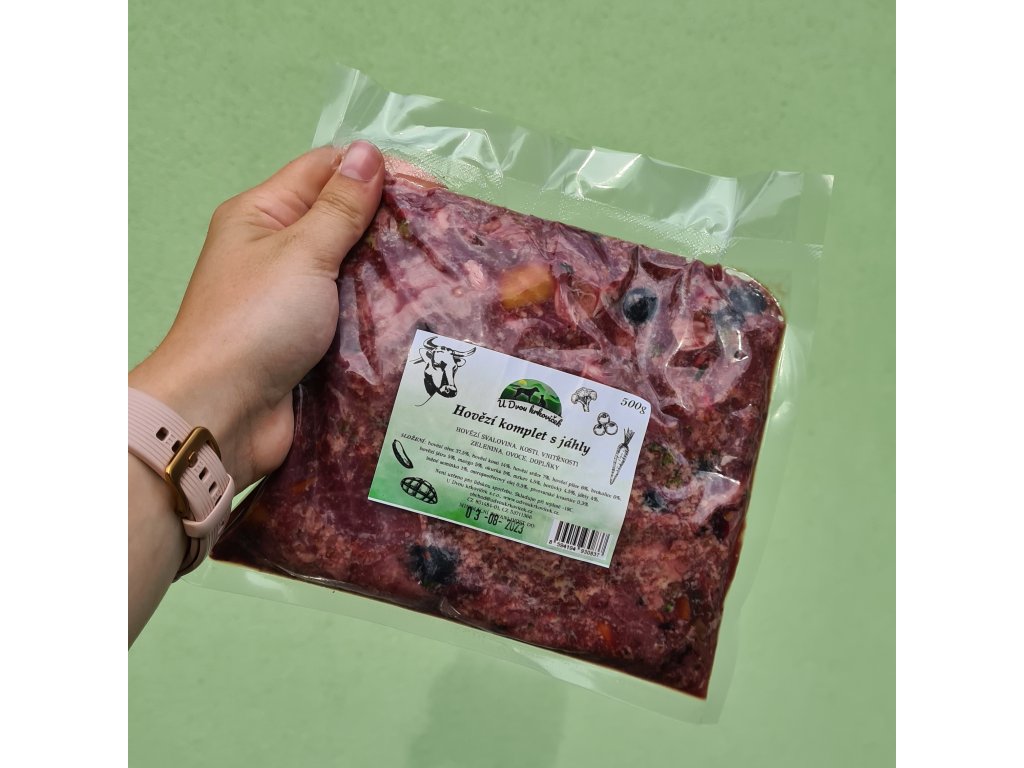 Složení: hovězí ořez 37,5%, hovězí kosti 14%, hovězí srdce 7%, hovězí plíce 6%, brokolice 6%, hovězí játra 5%, kapusta 5%, jablka 5%, mrkev 4,5%, borůvky 4,5%, jáhly 4%, lněné semínko 1%, ostropestřecový olej 0,5%, pivovarské kvasnice 0,3%