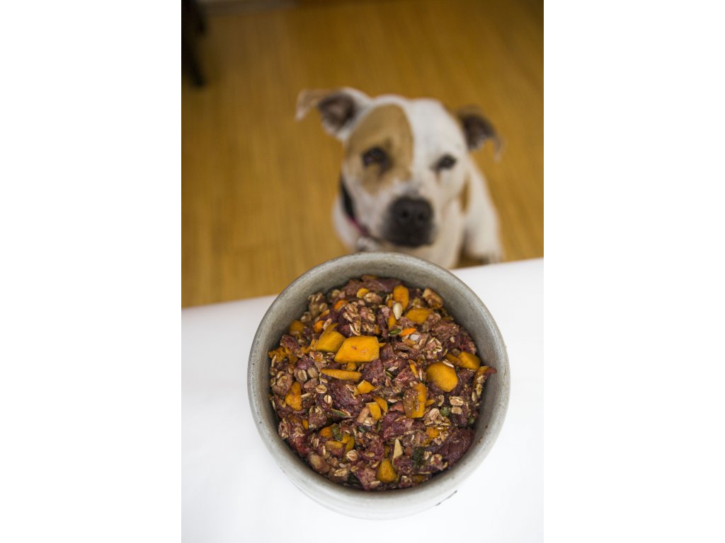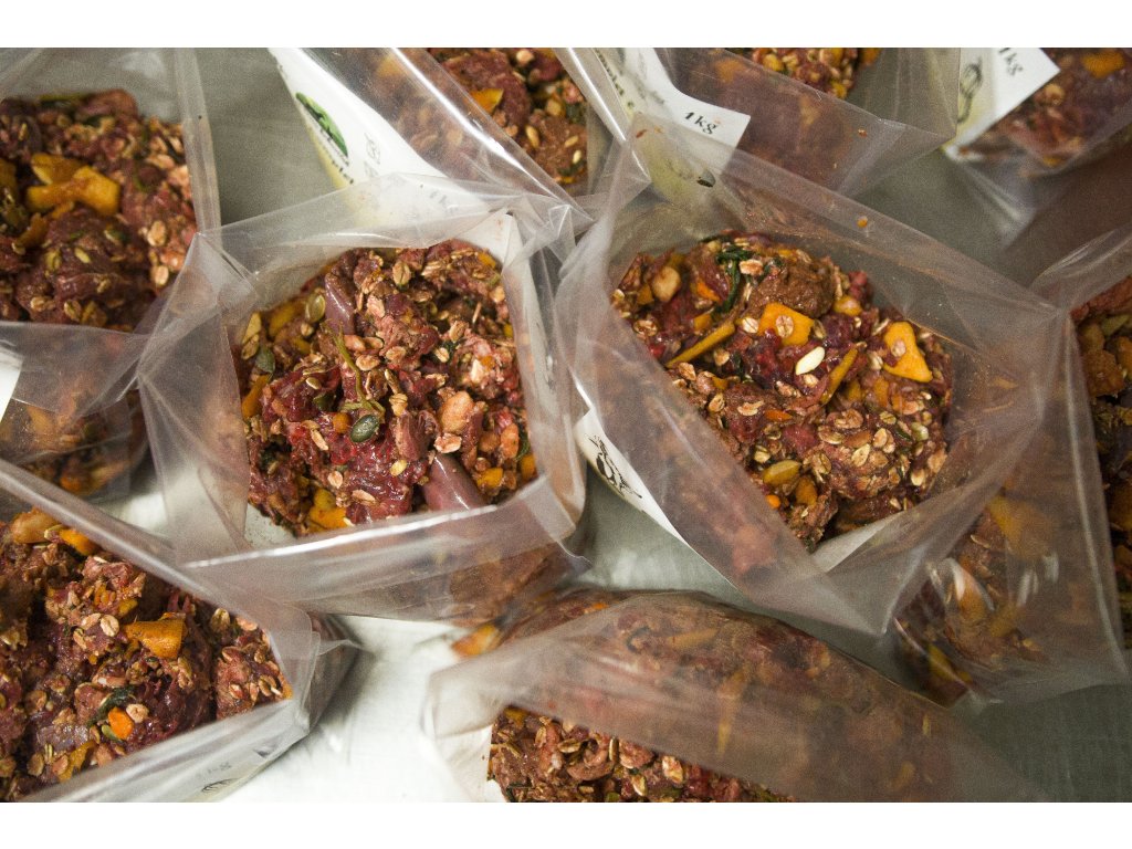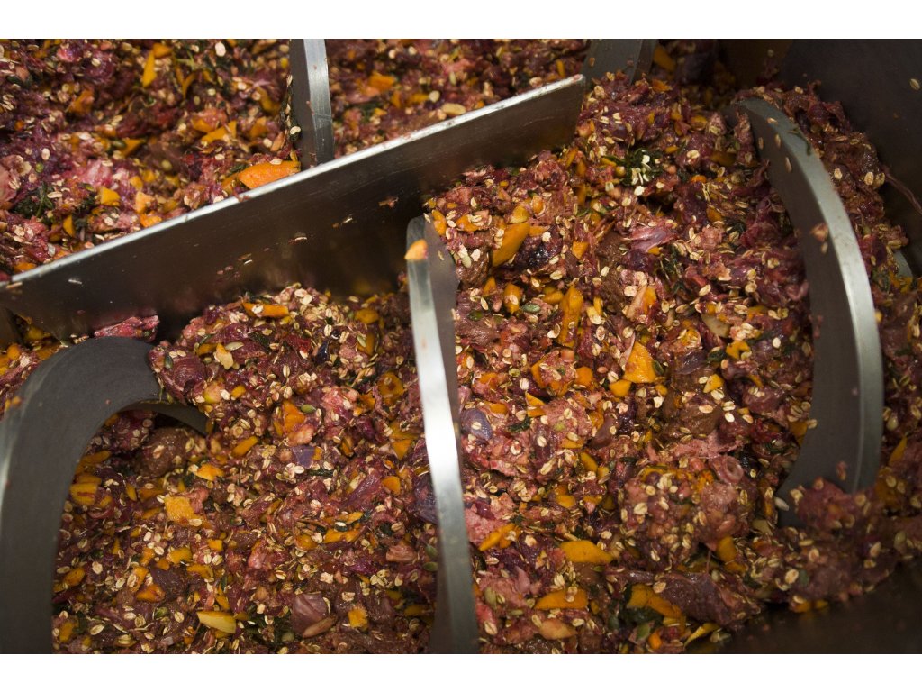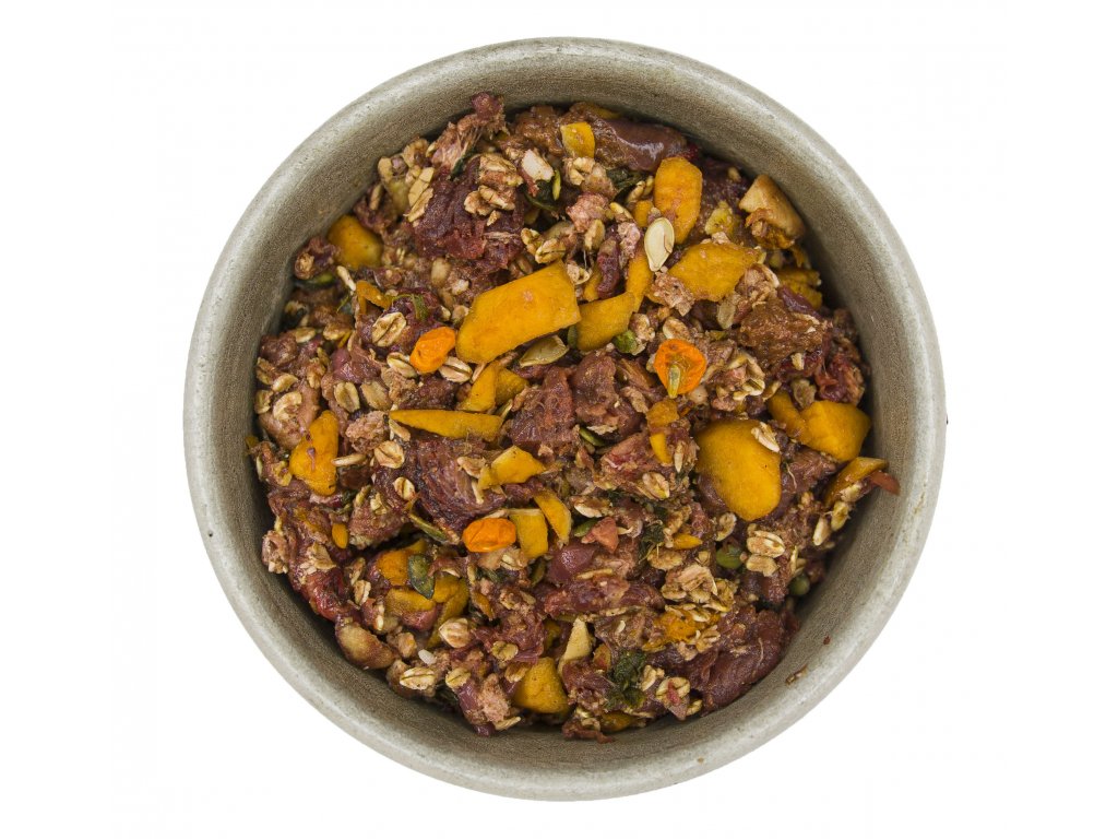 Složení: hovězí ořez 37%, hovězí kosti 14%, dýně 7%, hovězí srdce 7%, hovězí játra 7%, hovězí plíce 6%, špenát 6%, jahody 5%, jablka 4,5%, vločky 4%, dýňové semínko 1,2%, rakytník 0,7%, pivovarské kvasnice 0,3%, lososový olej 0,3%